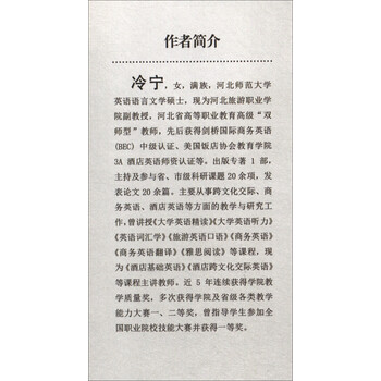 冷宁,女,满族,河北师范大学英语语言文学硕士,现为河北旅游职业学院副教授,河北省高等职业教育高级“双师型”教师,先后获得剑桥国际商务英语(BEC)中级认证、美国饭店协会教育学院3A酒店英语师资认证等。出版专著1部,主持及参与省、市级科研课题20余项,发表论文20余篇。主要从事跨文化交际、商务英语、酒店英语等方面的教学与研究工作,曾讲授《大学英语精读》《大学英语听力》《英语词汇学》《旅游英语口语》《商务英语》《商务英语翻译》《雅思阅读》等课程,现为《酒店基础英语》《酒店跨文化交际英语》等课程主讲教师。近5年连续获得学院教学质量奖,多次获得学院及省级各类教学能力大赛一、二等奖,曾指导学生参加全国职业院校技能大赛并获得一等奖。
